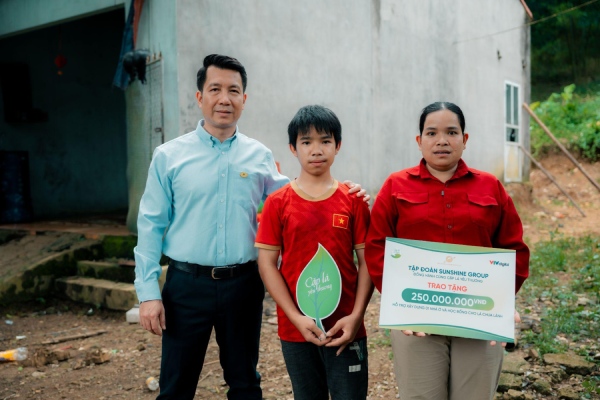 Tại buổi trao tặng, ông Nguyễn Anh Tuân - Phó Tổng Giám đốc CTCP Kinh doanh Bất động sản Noble (thuộc hệ sinh thái Sunshine Group) đã trực tiếp đến thăm hỏi, động viên và thay mặt Sunshine Group trao tặng mỗi gia đình 200 triệu đồng để xây dựng mái ấm mới, cùng 50 triệu đồng học bổng cho mỗi em nhỏ.