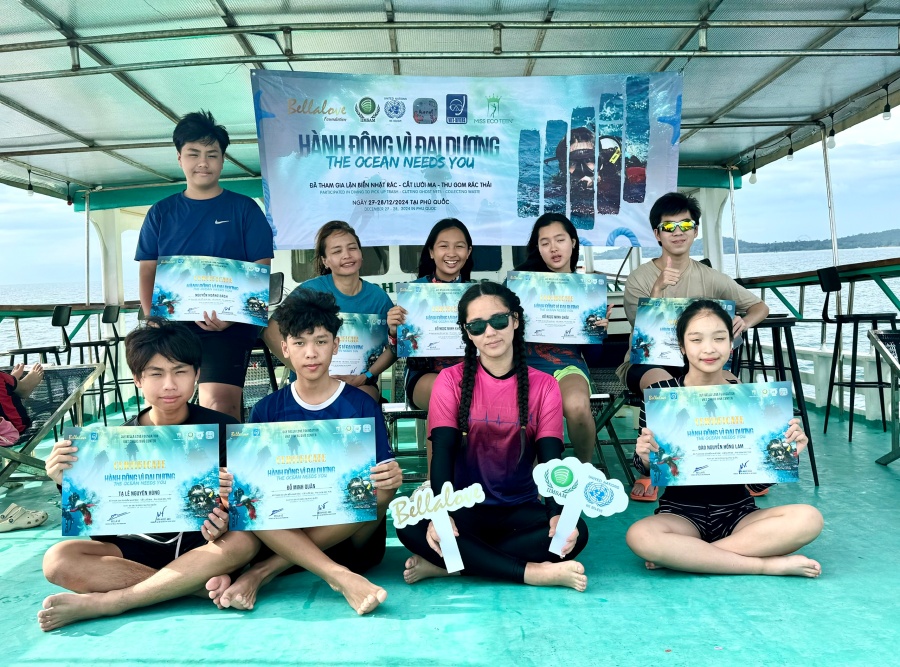 Hàng năm, vào những dịp cùng gia đình lặn biển, Bella Vũ luôn tham gia tích cực vào hoạt động lặn biển nhặt rác, bắt sao biển gai để “giải cứu” san hô, gỡ lưới ma bảo vệ sinh vật và môi trường biển.