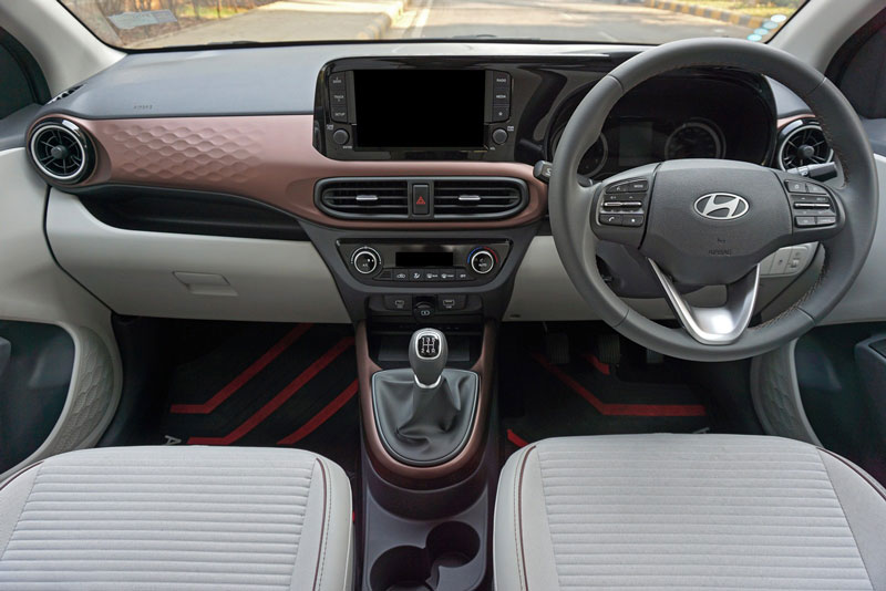 Bên trong cabin, Hyundai Aura mang đến không gian rộng rãi với các chất liệu cao cấp như ghế bọc nỉ và vô-lăng bọc da. Những tính năng đáng chú ý khác như hệ thống âm thanh Arkamys, sạc không dây, cổng USB-C và màn hình thông tin 3,5 inch giữa cụm đồng hồ.