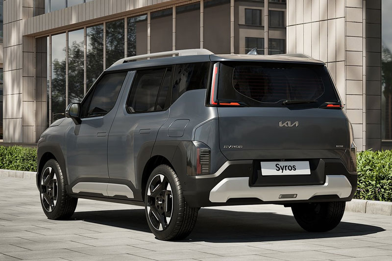 Kia Syros 2025 được phát triển trên nền tảng K1, mang thiết kế vuông vắn, mạnh mẽ. Xe sở hữu đèn pha LED xếp chồng theo chiều dọc, đèn hậu LED hình chữ L cùng các chi tiết hiện đại như trụ B dày, thanh ray trên nóc và tay nắm cửa có thể thu vào. Bánh xe hợp kim hai tông màu kết hợp với vòm bánh xe mở rộng, tạo dáng vẻ thể thao, khỏe khoắn. Phiên bản cao cấp nhất được trang bị mâm 17 inch.