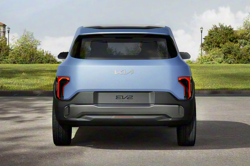 Về thiết kế, EV2 áp dụng ngôn ngữ Opposites United đặc trưng của Kia mang đến diện mạo trẻ trung, hiện đại và dễ nhận biết. Phần đầu xe nổi bật với đèn LED ban ngày hai dải, trong khi thân xe có kiểu dáng vuông vức giúp tăng không gian nội thất và tạo cảm giác vững chãi. Cụm đèn hậu được bố trí liền mạch với vòm bánh sau, mang đến phong cách thể thao và cảm giác trọng tâm thấp hơn.