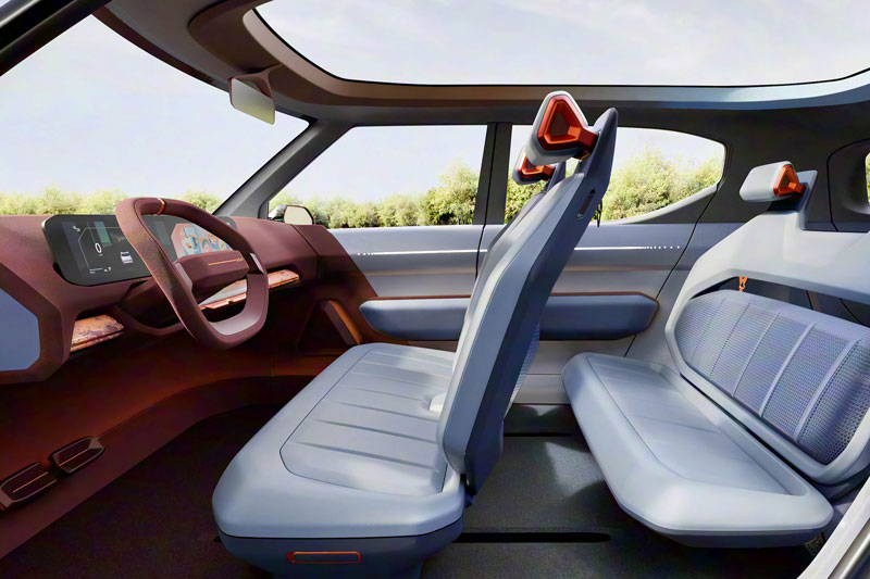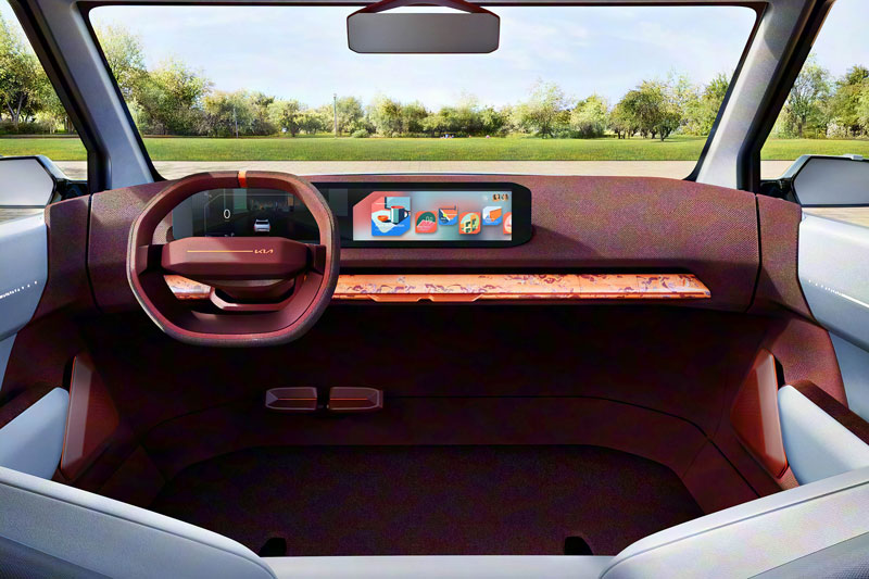 Khoang nội thất của Kia EV2 được thiết kế theo phong cách tối giản tinh tế, tập trung vào trải nghiệm người dùng. Nổi bật là màn hình kép nối liền phía trước vô-lăng hai chấu, hệ thống ghế liền khối cùng thiết kế loại bỏ hoàn toàn bệ tỳ tay trung tâm, tạo cảm giác rộng rãi và liền mạch. Đệm ghế sau có thể nâng lên linh hoạt, kết hợp với thanh trượt hàng ghế trước kéo dài, giúp tận dụng tối đa không gian chứa đồ.
