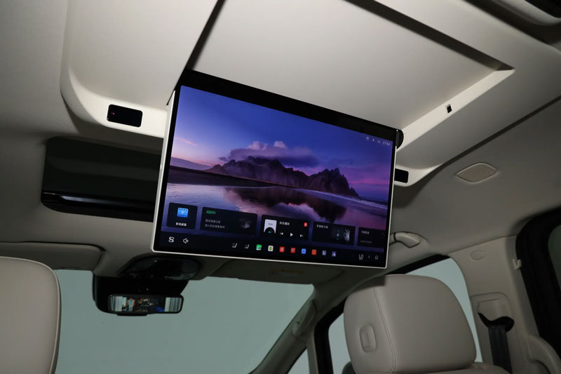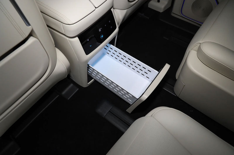Hàng ghế thứ ba có thể gập linh hoạt, với tựa lưng chỉnh điện, cùng rèm che nắng riêng cho từng hàng ghế. Thiết kế nội thất thân thiện với gia đình còn thể hiện qua bậc lên xuống hai tầng và tay vịn dài hai tầng ở cửa sau, giúp người già và trẻ nhỏ lên xuống dễ dàng hơn. Khu vực cốp xe có nguồn điện 220V tích hợp, trang bị màn hình giải trí 17,3 inch và tủ lạnh mini phía sau.