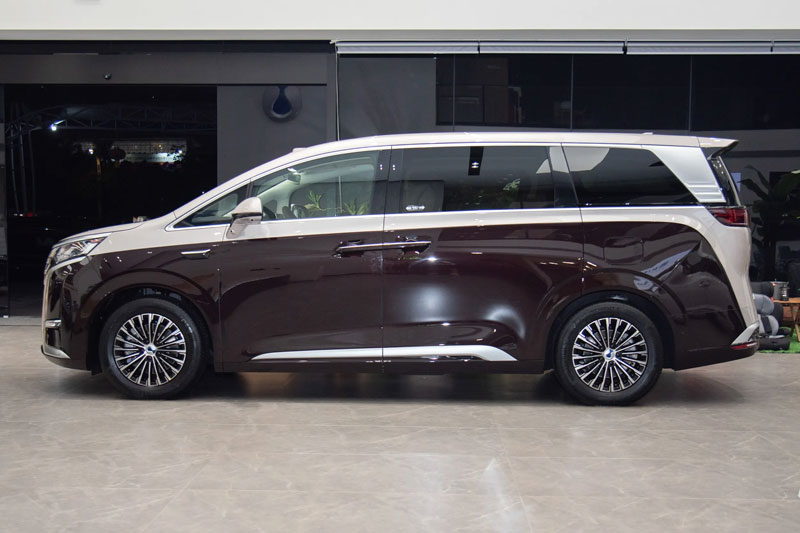 Về thiết kế ngoại thất, Denza D9 Supreme Edition gây ấn tượng với thân xe 2 tông màu độc đáo gồm tím và mây bồng bềnh, kết hợp ngôn ngữ thiết kế π-Motion lấy cảm hứng từ gia đình, tạo nên dáng vẻ cao cấp và khác biệt. Xe được trang bị đèn hậu dạng thấu kính hiện đại cùng chi tiết ngoại thất màu bạc nổi bật giúp nó dễ dàng nhận diện trên đường.