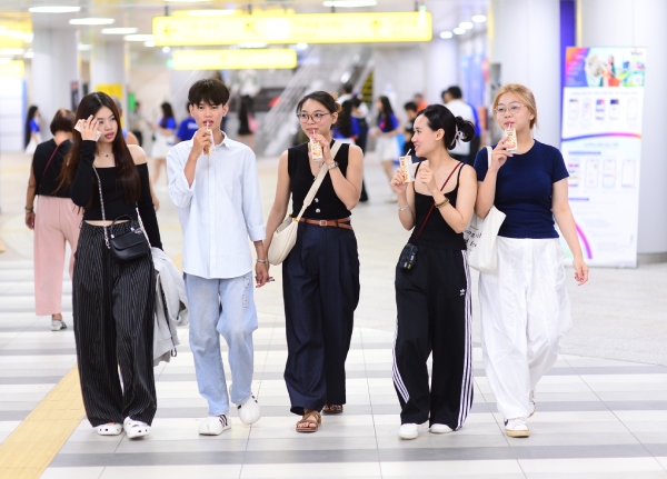 Hành trình tiếp theo của tuyến metro dừng lại tại ga Đại học Quốc gia. Ở đây luôn tấp nập với hành khách phần lớn là sinh viên. Các bạn chia sẻ từ ngày metro được vận hành thì việc đi học nhanh và tiện hơn rất nhiều, 2 tuần nay đều đi tàu điện đi học và đặc biệt còn được thưởng thức sữa chua Vinamilk ngay tại ga.