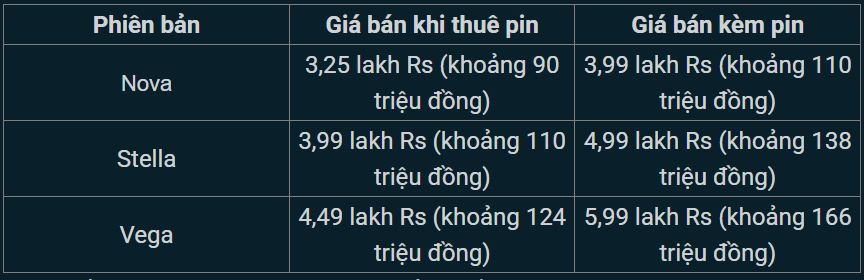 Vayve Eva có tổng cộng 3 phiên bản, mỗi phiên bản được trang bị một bộ pin có kích thước khác nhau và tùy chọn mái che năng lượng mặt trời. Đối với những khách hàng muốn mua mẫu ô tô điện này kèm mua pin, mức giá khởi điểm là 3,99 lakh Rs (khoảng 110 triệu đồng). Mức giá này áp dụng cho 25.000 người mua đầu tiên. Đồng thời, những khách hàng đầu tiên này cũng nhận được các ưu đãi bổ sung là cập nhật qua mạng không giới hạn và 3 năm dịch vụ kết nối.