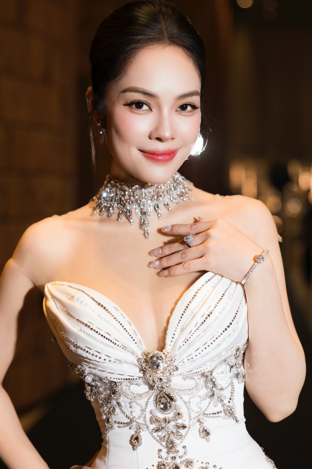 Mẫu váy cưới này, thuộc bộ sưu tập Hacchic Couture, vốn đã gây tiếng vang khi được Mai Davika - biểu tượng thời trang Thái Lan - khoác lên mình. Phiên bản mới của Hacchic vẫn giữ được những đường nét tinh tế, sang trọng nhưng được tinh chỉnh để tôn vinh tối đa vóc dáng và thần thái của người mặc. Và Dương Cẩm Lynh đã chứng minh điều đó một cách hoàn hảo.