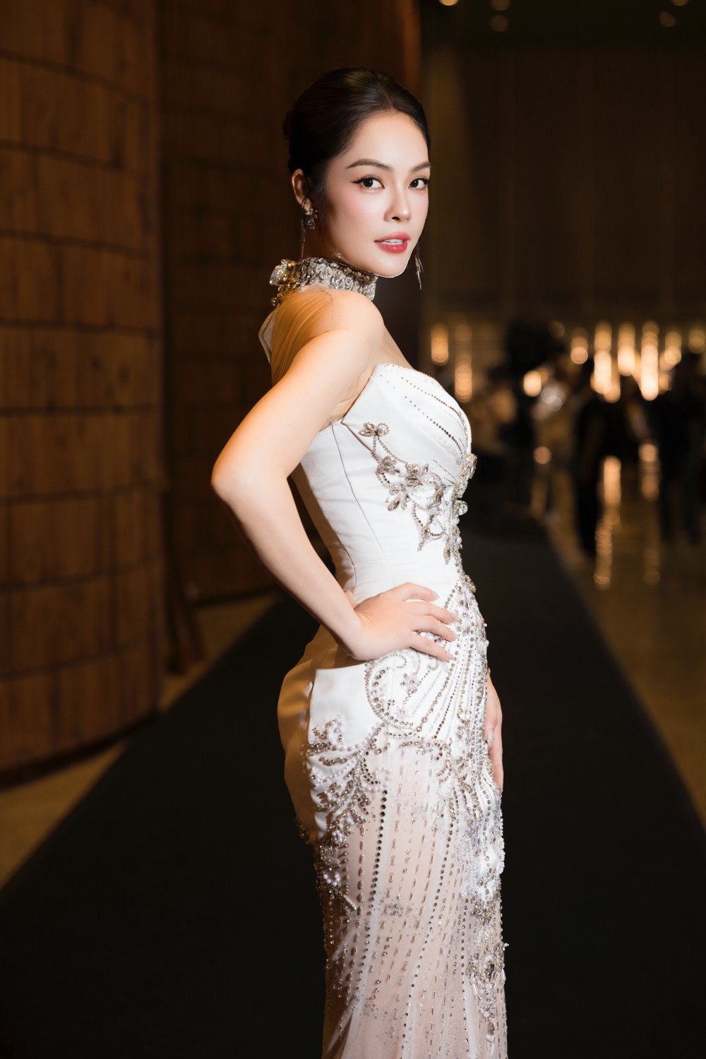 Với vòng eo 58cm thon gọn và đường cong quyến rũ, Dương Cẩm Lynh đã biến chiếc váy trở thành một "lớp da thứ hai", ôm sát và tôn lên vẻ đẹp kiêu sa, đài các của cô. Từng đường nét thiết kế, từ phần cúp ngực gợi cảm đến tùng váy xòe bồng bềnh, đều được Dương Cẩm Lynh thể hiện một cách đầy tinh tế và quyến rũ.