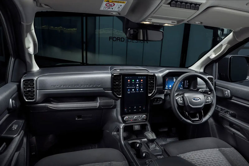 Bước vào bên trong, nội thất của Ranger Super Duty vẫn giữ thiết kế hình bát giác quen thuộc và màn hình cảm ứng trung tâm 12 inch dựng dọc đầy hiện đại. Tuy nhiên, chất riêng của bản Super Duty vẫn hiện rõ qua chi tiết chữ “Super Duty” dập nổi ở bảng táp-lô bên hành khách, cùng với dãy công tắc phụ trợ được bố trí phía trên – sẵn sàng để đấu dây cho các thiết bị chuyên dụng.