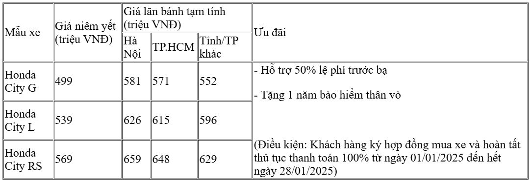 Tham khảo giá niêm yết và lăn bánh mới nhất của mẫu xe Honda City cập nhật tháng 1/2025:
