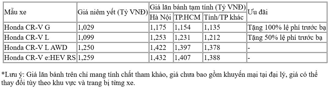 Giá niêm yết và lăn bánh tạm tính xe Honda CR-V cập nhật tháng 2/2025: