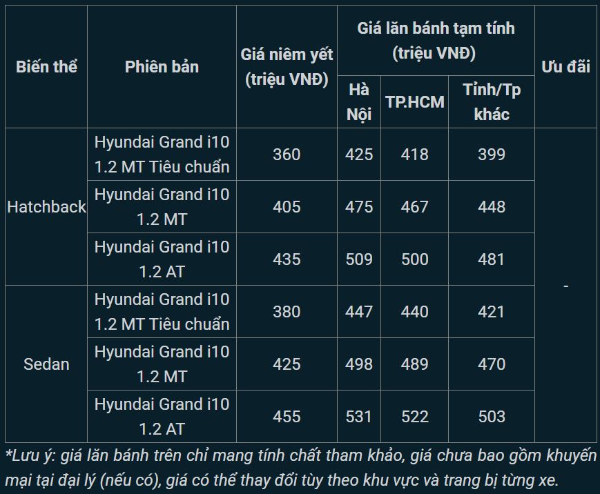 Tham khảo giá niêm yết và lăn bánh xe Hyundai Grand i10 mới nhất tháng 2/2025: