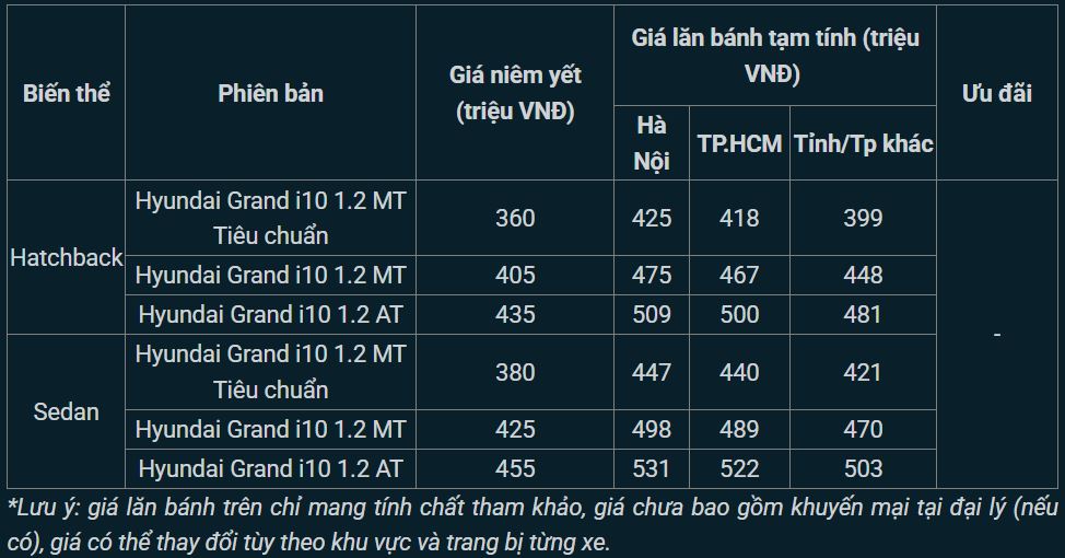 Tham khảo giá niêm yết và lăn bánh xe Hyundai Grand i10 mới nhất tháng 1/2025: