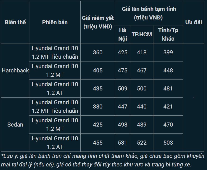 Tham khảo giá niêm yết và lăn bánh xe Hyundai Grand i10 mới nhất tháng 2/2025: