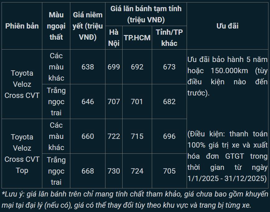 Tham khảo giá lăn bánh tạm tính của mẫu xe Toyota Veloz Cross cập nhật tháng 2/2025: