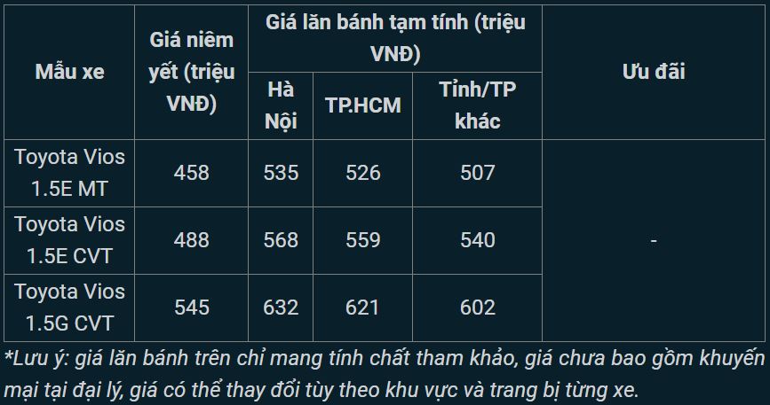 Tham khảo giá niêm yết và lăn bánh tạm tính xe ô tô Toyota Vios cập nhật tháng 1/2025