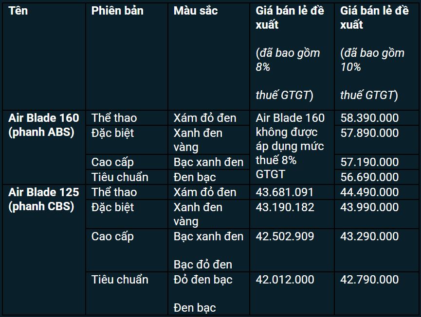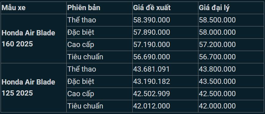 Giá xe Honda Air Blade 2025 được khảo sát tại đại lý như sau: