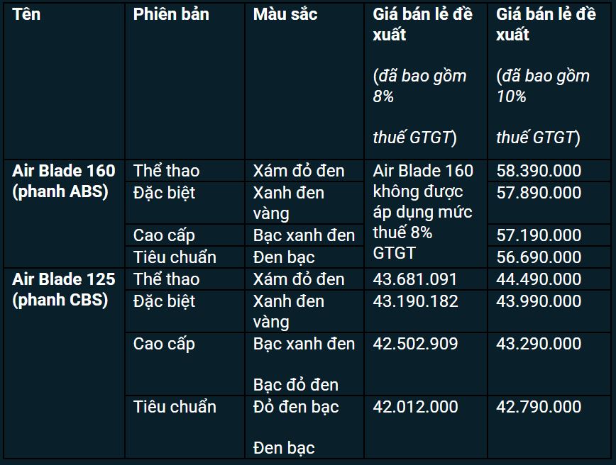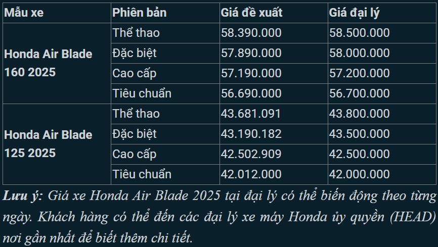 Giá xe Honda Air Blade 2025 được khảo sát tại đại lý như sau:
