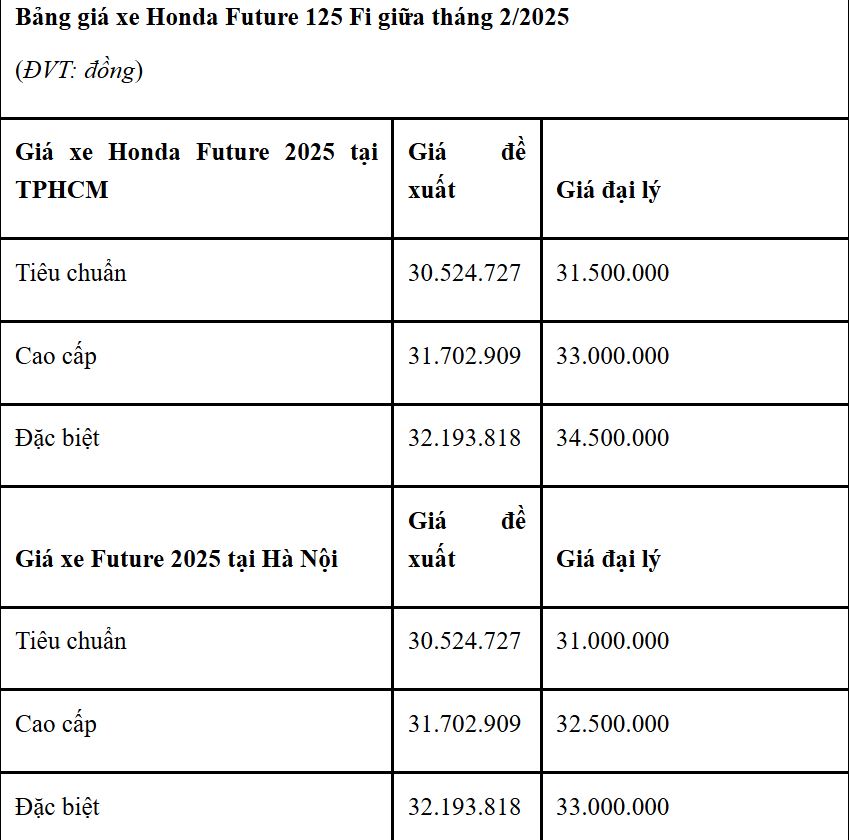 Bảng giá xe Honda Future 125 FI 2025 mới nhất tại đại lý:
