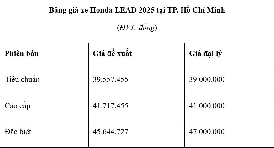 Tại Việt Nam, Honda LEAD 125 2025 đang được phân phối với 3 phiên bản Tiêu chuẩn, Cao cấp và Đặc biệt. Mức giá đề xuất bán lẻ dao động từ 39,557 - 42,797 triệu đồng.