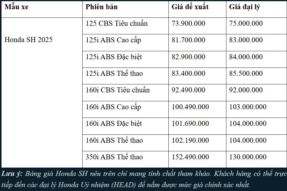 Theo ghi nhận tại một số đại lý, mẫu xe tay ga Honda SH 2025 đang sở hữu mức giá rất hấp dẫn khi được giảm từ 500 – 1 triệu đồng so với tháng trước, các phiên bản gần như đã về sát giá đề xuất, thậm chí SH 160i Tiêu chuẩn và SH 350i đã giảm xuống dưới giá đề xuất của hãng.