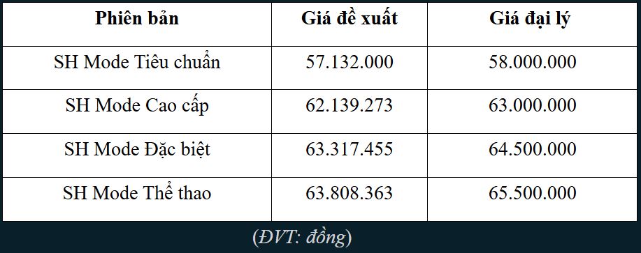 Hiện tại, SH Mode 2025 đã có mặt tại đại lý và được chào bán với giá khá hấp dẫn, các phiên bản chỉ chênh với giá đề xuất từ 500 nghìn – 1,5 triệu đồng, thậm chí có đại lý bán ngang giá đề xuất. Sở dĩ mức giá trên được coi là hấp dẫn bởi trước đó, SH Mode từng là một trong những mẫu xe đội giá cao nhất Việt Nam, có thời điểm đại lý bán chênh hơn 10 triệu đồng so với giá đề xuất.