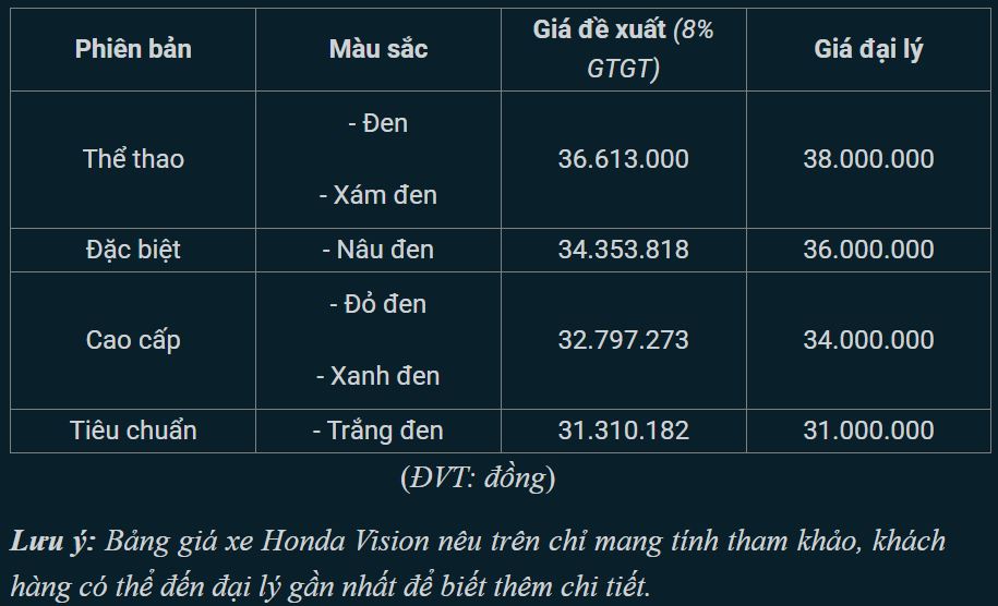 Honda Vision 2025 đang được phân phối tại thị trường Việt Nam với 4 phiên bản gồm: Tiêu chuẩn, Thể thao, Đặc biệt, Cao cấp. Giá xe Vision đang khá dễ chịu khi hàng loạt các đại lý đồng loạt giảm giá để thu hút khách hàng.
