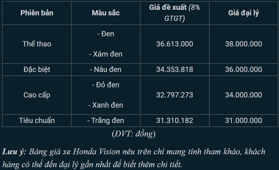 Lưu ý: Bảng giá xe Honda Vision nêu trên chỉ mang tính tham khảo, khách hàng có thể đến đại lý gần nhất để biết thêm chi tiết.