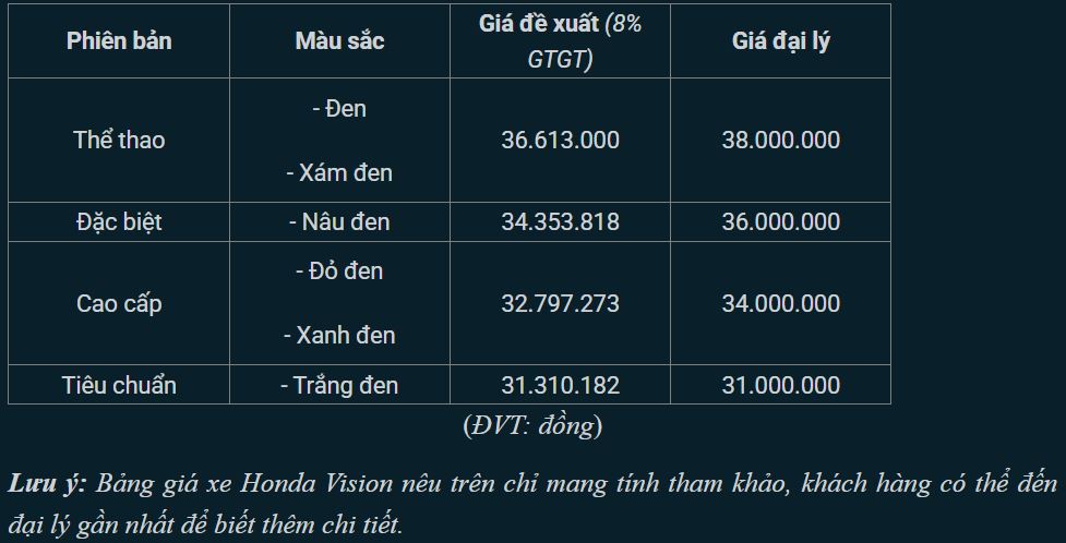 Honda Vision 2025 đang được phân phối tại thị trường Việt Nam với 4 phiên bản gồm: Tiêu chuẩn, Thể thao, Đặc biệt, Cao cấp. Giá xe Vision đang khá dễ chịu khi hàng loạt các đại lý đồng loạt giảm giá để thu hút khách hàng.