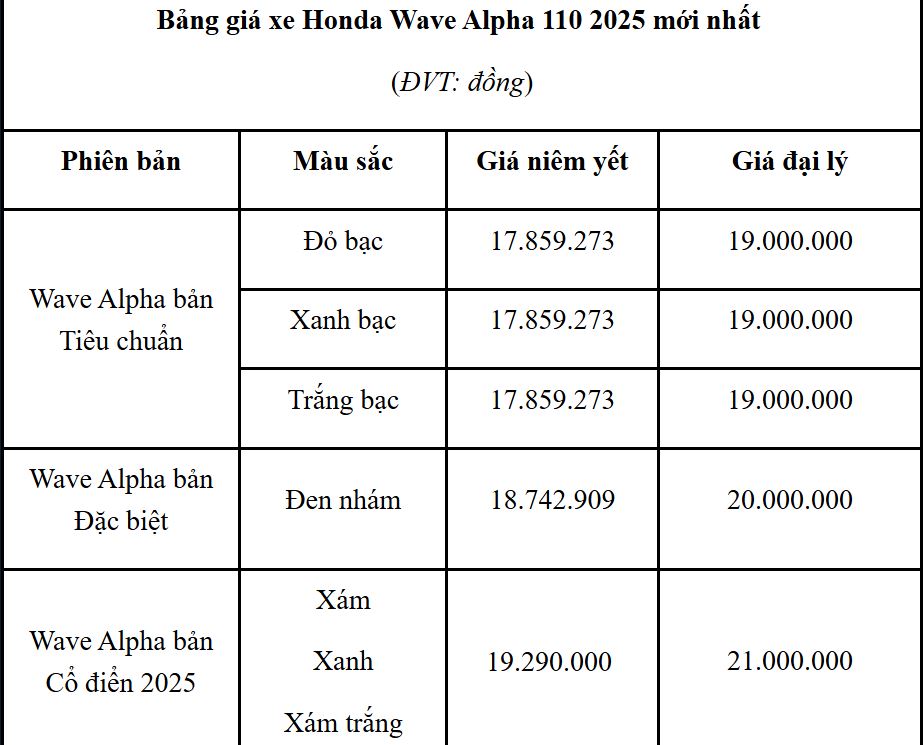 Lưu ý: Bảng giá xe Honda Wave Alpha 110 2025 ở trên chỉ mang tính chất tham khảo. Giá xe có thể thay đổi tùy theo thời điểm của mỗi đại lý Honda và khu vực bán xe.