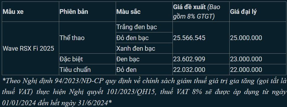 Honda Wave RSX FI mới được mở bán tại Việt Nam từ ngày 6/12/2023 với 3 phiên bản cùng mức giá đề xuất dao động từ 22 – 24,5 triệu đồng (đã bao gồm VAT 8%). Chỉ trong ít ngày bán chính thức, mẫu xe số này đã được các đại lý ưu đãi hàng triệu đồng.