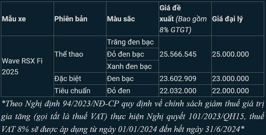 Honda Wave RSX FI mới được mở bán tại Việt Nam từ ngày 6/12/2023 với 3 phiên bản cùng mức giá đề xuất dao động từ 22 – 24,5 triệu đồng (đã bao gồm VAT 8%). Chỉ trong ít ngày bán chính thức, mẫu xe số này đã được các đại lý ưu đãi hàng triệu đồng.