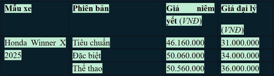 Lưu ý: Bảng giá xe Honda Winner X ở trên chỉ mang tính chất tham khảo. Giá xe có thể thay đổi tùy theo thời điểm của mỗi đại lý Honda và khu vực bán xe.