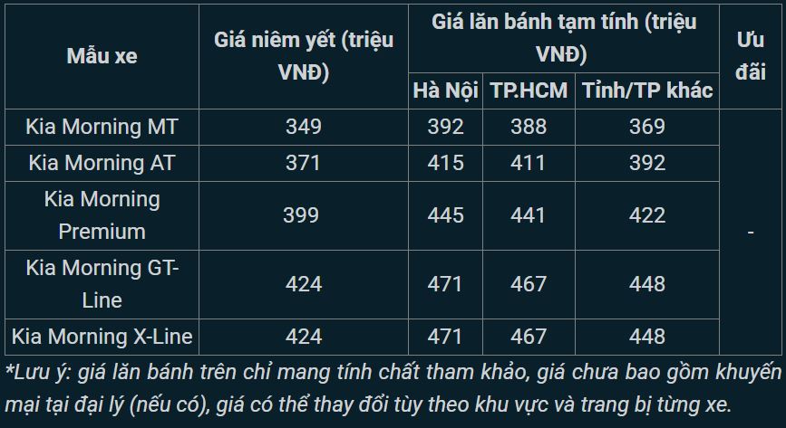 Tham khảo giá niêm yết và lăn bánh xe Kia Morning cập nhật mới nhất tháng 2/2025: