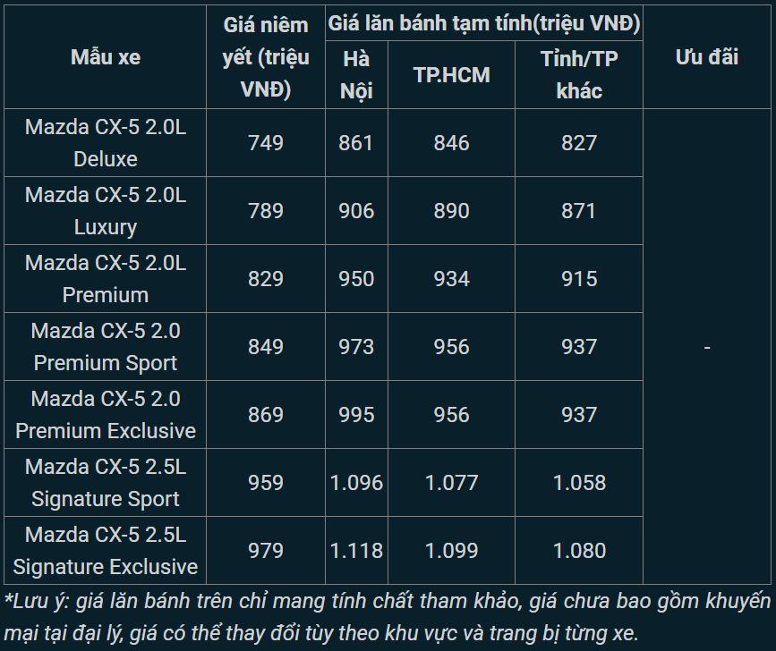 Tham khảo giá niêm yết và giá lăn bánh tạm tính của Mazda CX-5 mới nhất tháng 2/2025: