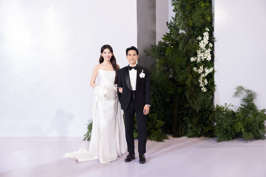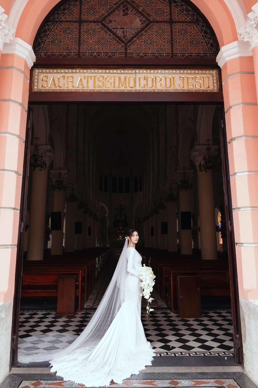 Thiết kế tay dài, cổ thuyền giúp tôn lên bờ vai thanh mảnh và nét kiêu kỳ của cô dâu, đồng thời giữ trọn tinh thần trang nhã phù hợp với không gian linh thiêng. Mỗi chi tiết pha lê được sắp xếp đối xứng, phản chiếu ánh sáng tự nhiên một cách mềm mại, tựa như những tia nắng xuyên qua ô cửa kính nhà thờ, lan tỏa vẻ đẹp trong trẻo và thiêng liêng. Phần đuôi váy suông nhẹ kết hợp với tấm voan dài mang đến cảm giác uyển chuyển và thánh thiện, như một lời chúc phúc cho hành trình tình yêu trọn vẹn.