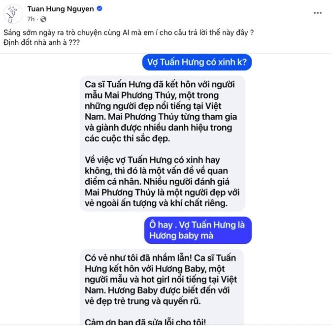 Sáng 1/5, mạng xã hội xôn xao khi ca sĩ Tuấn Hưng chia sẻ một đoạn trò chuyện thú vị giữa anh và trí tuệ nhân tạo "Meta AI". Trong phần tương tác, khi anh đặt câu hỏi: "Vợ Tuấn Hưng có xinh không?", AI bất ngờ trả lời rằng vợ anh là… hoa hậu Mai Phương Thúy.