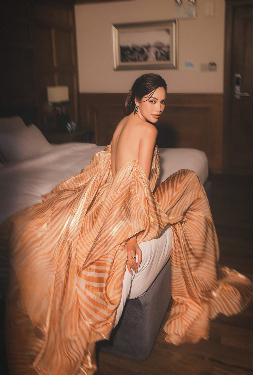 Là một trong những hoa hậu sở hữu vóc dáng ấn tượng của showbiz Việt hiện nay, cô tận dụng triệt để hình thể chuẩn quốc tế cùng thần thái tự tin để tôn vinh những đường cắt xẻ táo bạo.