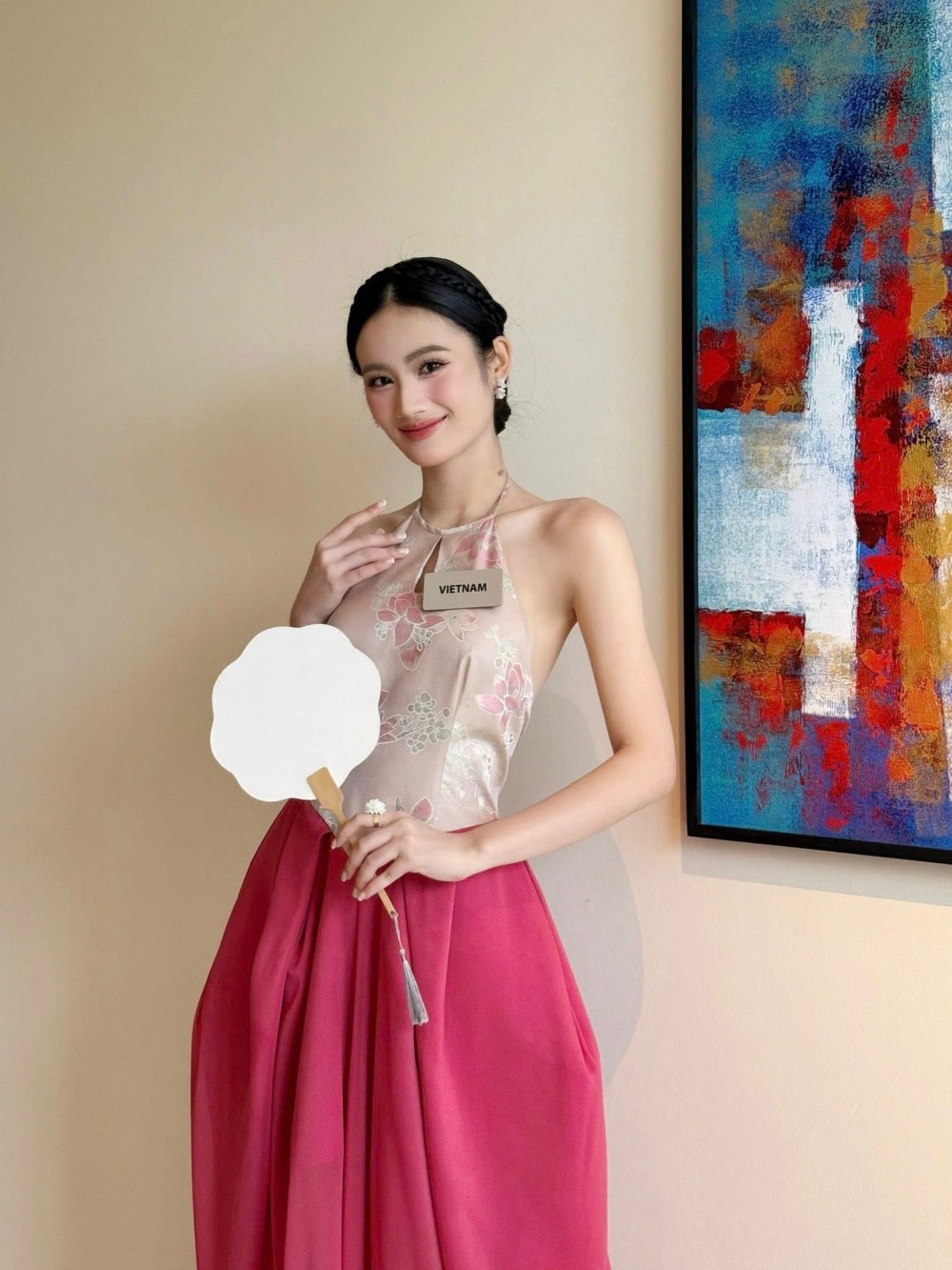 Sáng 26/5, ngày thứ 20 tại Miss World, Hoa hậu Ý Nhi lần nữa quảng bá văn hoá Việt thông qua thời trang. Cô diện áo yếm thêu hoa văn, kết hợp chân váy hồng phom dáng lạ mắt với nhiều nếp xếp ly lớn. Kiểu tóc tết bím và búi thấp làm nổi bật hình ảnh duyên dáng, đậm chất phụ nữ Việt. Đến tối, Ý Nhi xuất hiện lộng lẫy với đầm dạ hội đính kết tinh tế khi tham dự đêm Gala Beauty With A Purpose.