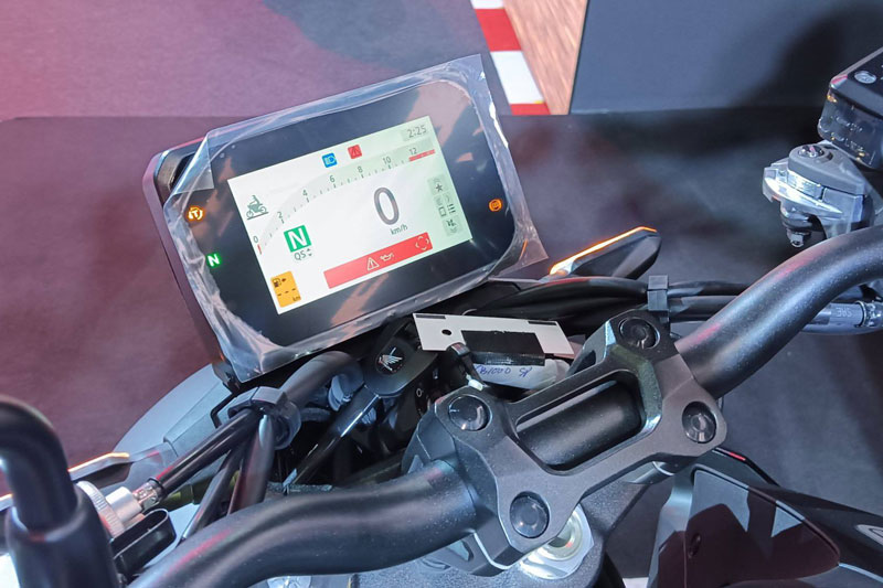Honda CB1000 SP 2025sử dụng màn hình TFT-LCD 5 inch sắc nét tích hợp hệ thống Honda Roadsync cho phép kết nối smartphone, mang lại trải nghiệm lái thông minh và tiện lợi. Chiều cao yên xe được thiết kế ở mức 809 mm, khá thân thiện với đa số người lái châu Á, còn trọng lượng xe ở mức 212 kg khi đầy bình xăng 17 lít, đủ nhẹ để xử lý linh hoạt nhưng vẫn đủ đầm để vững vàng ở tốc độ cao. Cặp bánh 17 inch trước và sau đi kèm bộ lốp 120/70 và 180/55 giúp CB1000 SP cân bằng giữa vẻ thể thao và hiệu năng vận hành tối ưu.