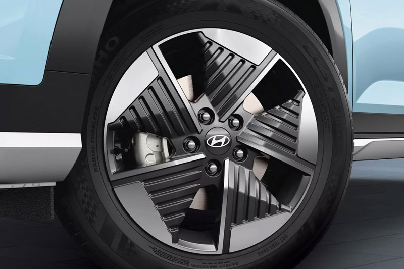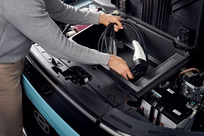 Thiết kế ngoại thất của xe nổi bật với đèn pha và đèn LED DRL hình chữ L ngược kép, giống như phiên bản SU2i 2024. Lưới tản nhiệt được che phủ bằng các thành phần pixel tạo điểm nhấn tương lai. Logo Hyundai tích hợp trên nắp sạc phía trước. Cánh gió chủ động, tự động điều chỉnh để tăng cường khả năng làm mát và tối ưu khí động học. Bộ vành hợp kim 17 inch khí động học, kết hợp lốp xe có lực cản lăn thấp.