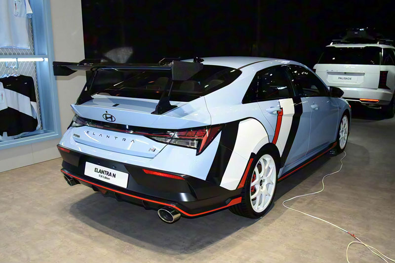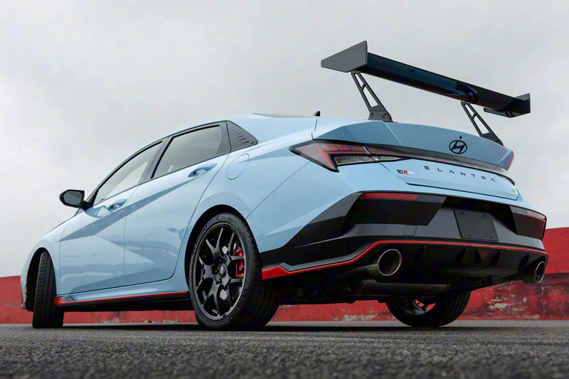 Phần đuôi của Hyundai Elantra N TCR Edition gây ấn tượng với cánh gió “cổ ngỗng” cỡ lớn, hệ thống ống xả kép và tấm khuếch tán gió sau được sơn đỏ tạo nên diện mạo đậm chất xe đua chuyên nghiệp.