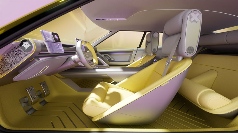 Khoang nội thất tiếp tục duy trì 2 tông màu xám và vàng chủ đạo. Các ghế ngồi mang hình dáng quả trứng với tựa đầu chữ nhật cỡ lớn, bảng táp-lô và bảng điều khiển trung tâm dạng ống, đi kèm nhiều chi tiết thú vị như nút điều khiển điều hòa vật lý, tay nắm cửa độc đáo, vô-lăng chữ nhật chỉ với một nan hoa và màn hình Parametric Pixel hiển thị tùy chỉnh. Biểu tượng linh vật Mr. Pix cũng xuất hiện trong nhiều chi tiết nội thất và ngoại thất tăng thêm chất “concept” đặc biệt cho mẫu xe.