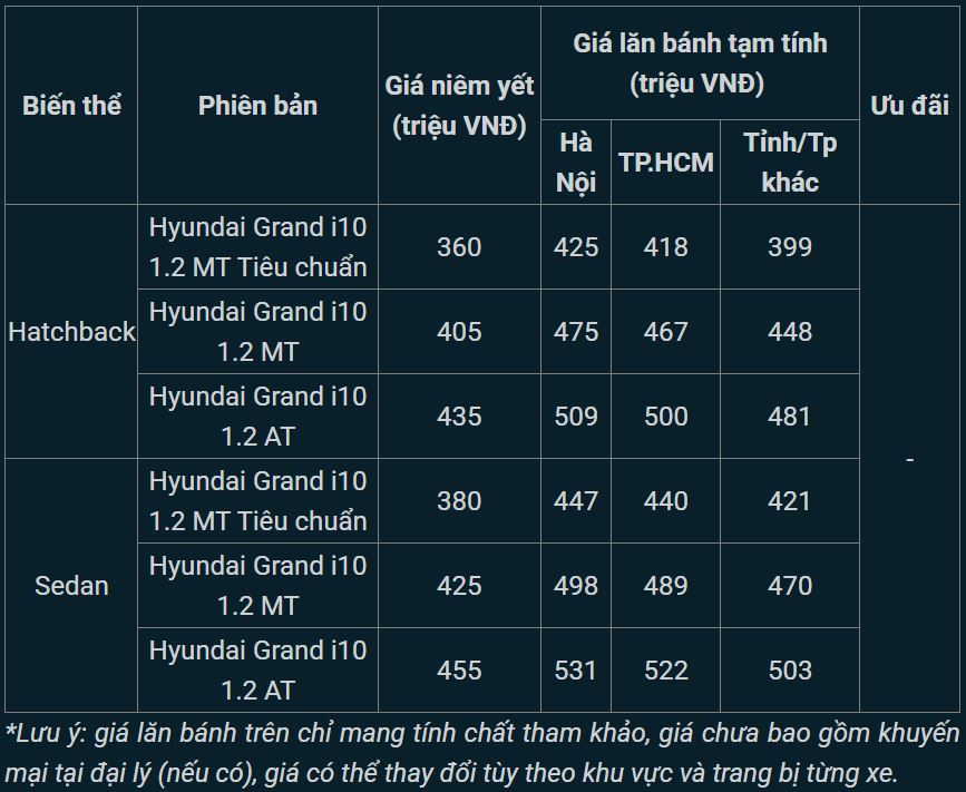 Tham khảo giá niêm yết và lăn bánh xe Hyundai Grand i10 mới nhất tháng 2/2025: