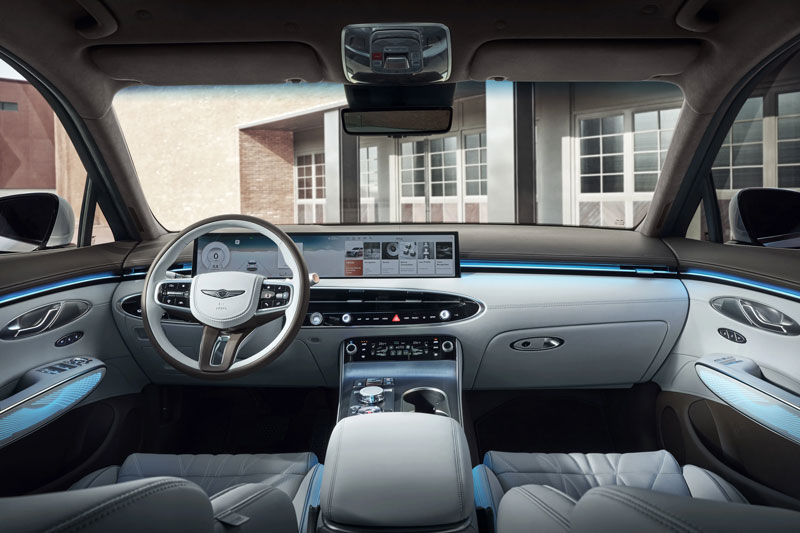 Khoang nội thất cũng được nâng cấp nhẹ với phối màu mới Obsidian Black/Vanilla Beige cùng đường chỉ khâu xám tinh tế, mang đến không gian sang trọng và ấm cúng hơn. Ghế ngồi được bọc da thật tiêu chuẩn, trong khi gói Sport Design bổ sung thêm chất liệu và màu sắc đồng bộ với dòng Genesis Black Line. Cụm điều khiển trung tâm giữ nguyên thiết kế trực quan, kết hợp vô-lăng thể thao, cụm đồng hồ kỹ thuật số, và màn hình giải trí cỡ lớn mang đậm phong cách hiện đại.