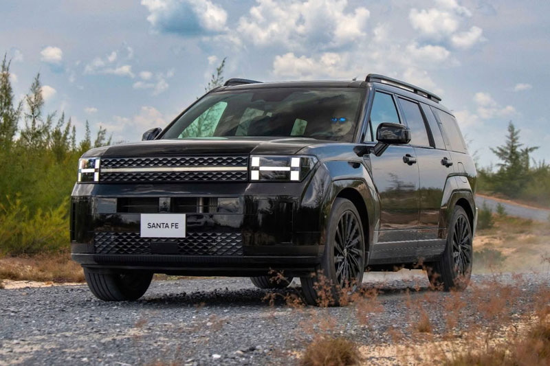Hyundai Santa Fe thế hệ mới mang phong cách thiết kế ngoại thất boxy khối hộp đậm chất SUV cổ điển, với cụm đèn chiếu sáng và nắp capo đẩy lên cao, tạo nên tổng thể khoẻ khoắn và thể thao. Điểm nhấn ở phần đầu xe là cụm đèn chiếu sáng Adaptive LED thích ứng tự động (AHB-LED), cùng cụm đèn chiếu sáng ban ngày tạo hình chữ H. Bên cạnh đó, mặt ca-lăng lấy cảm hứng từ logo Hyundai dạng phẳng 2D, làm nên tổng thể thiết kế táo bạo cá tính. Mặt ca-lăng của xe được trang bị tính năng AAF (Active Air Flap) mở/ đóng tự động thông minh tùy theo các chế độ vận hành nhằm tối ưu hệ số cản gió nhưng vẫn đảm bảo làm mát động cơ và hệ thống phanh.