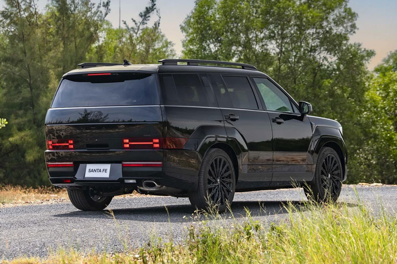 Santa Fe thế hệ hoàn toàn mới cũng trở nên cứng cáp, góc cạnh hơn nhờ phần vòm bánh xe lồi ra, vuông vức. Thân xe thiết kế dạng phẳng tối giản, phù hợp với một chiếc SUV kích thước lớp cũng như giúp tối ưu hoá không gian bên trong. Phần đuôi xe tiếp tục sử dụng công nghệ LED với tạo hình đèn hậu hình chữ H đồng bộ với cụm đèn trước, gia tăng khả năng nhận diện khi di chuyển. Phần đuôi xe có thiết kế phẳng hài hoà trong tổng thể thiết kế khối hộp của xe cũng như gia tăng tiện ích với cốp điện tự động.