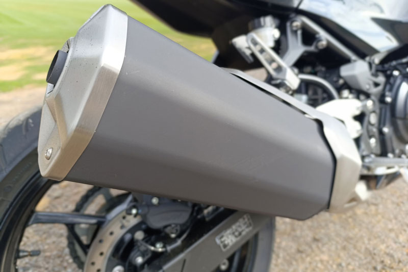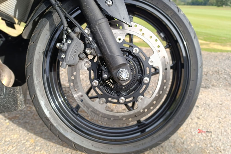 Phuộc nhún trước dạng ống lồng đường kính 41 mm và hành trình 120 mm, giảm xóc sau lò xo trụ đơn với hành trình 130 mm. Kích cỡ lốp trước, sau lần lượt là 110/70R17M/C 54H và 150/60R17M/C 66H. Bánh trước dùng thắng đĩa đơn 310 mm, 2 piston. Đĩa đơn phía sau 220 mm, 2 piston. Hệ thống chống bó cứng phanh (ABS) là trang bị tiêu chuẩn trên 2 kênh.