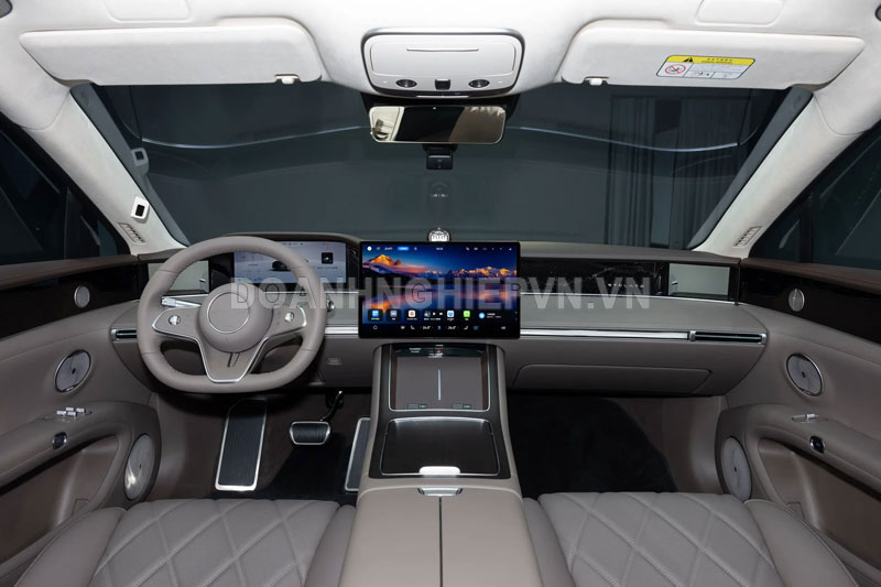Khoang nội thất của Stelato S9 EREV mang đậm phong cách đối xứng, được phủ da Nappa màu nâu nấm cục sang trọng. Xe có bảng điều khiển kỹ thuật số 12,3 inch, màn hình trung tâm 15,6 inch và vô lăng ba chấu đáy phẳng, tạo cảm giác thể thao nhưng vẫn đẳng cấp.