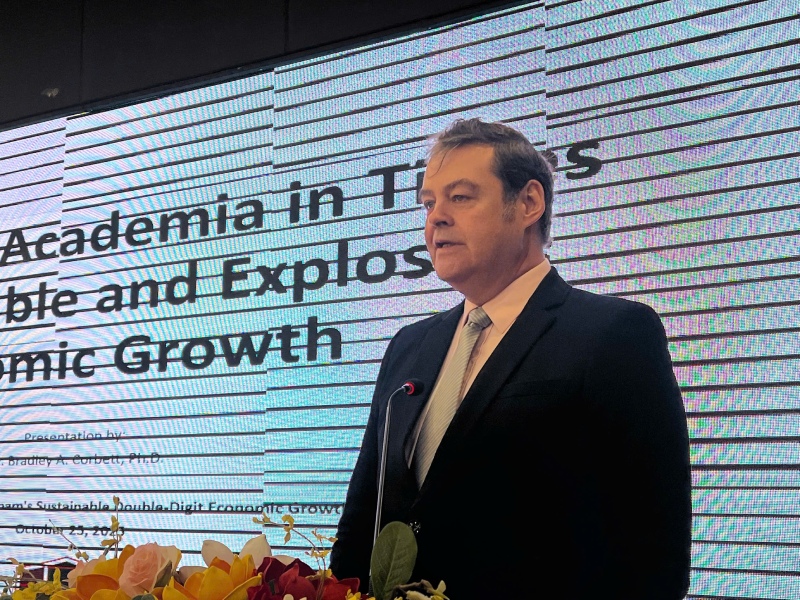 Đáng chú ý, TS Bradley A. Corbett - Nhà sáng lập MyEnglishGym (Ontario, Canada) đã chia sẻ về vai trò trung tâm của giới học thuật trong thời kỳ tăng trưởng bền vững và bùng nổ. TS Corbett cho rằng, khi Việt Nam đang chuẩn bị bước vào giai đoạn tăng trưởng vượt bậc, các trường đại học có thể trở thành “đối tác chiến lược tin cậy” cho khu vực công và doanh nghiệp, đảm nhận vai trò tư vấn, nghiên cứu và cung cấp giải pháp cho các vấn đề quản trị đương đại.